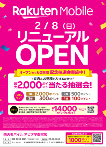 2階にございます「楽天モバイルアピタ宇都宮店」は改装工事を終え、この度リニューアルオープンいたしました!